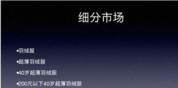 假如选择了超薄羽绒服,其实还是很大,那就在超薄款羽绒服里再进行特定年龄细分,比如说40岁超薄羽绒服;也可以在超薄羽绒服里进行价格细分,比如200元以下超薄羽绒服。