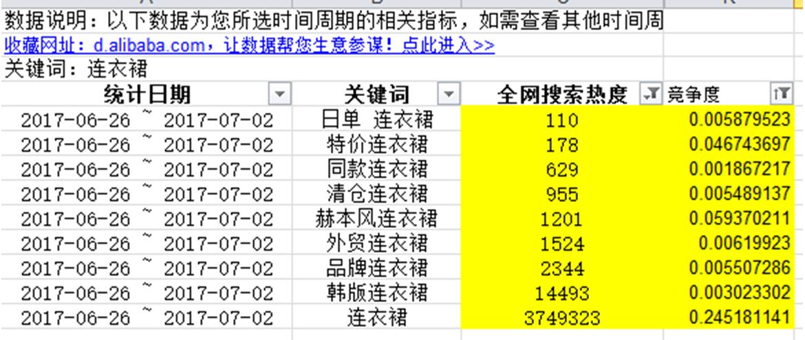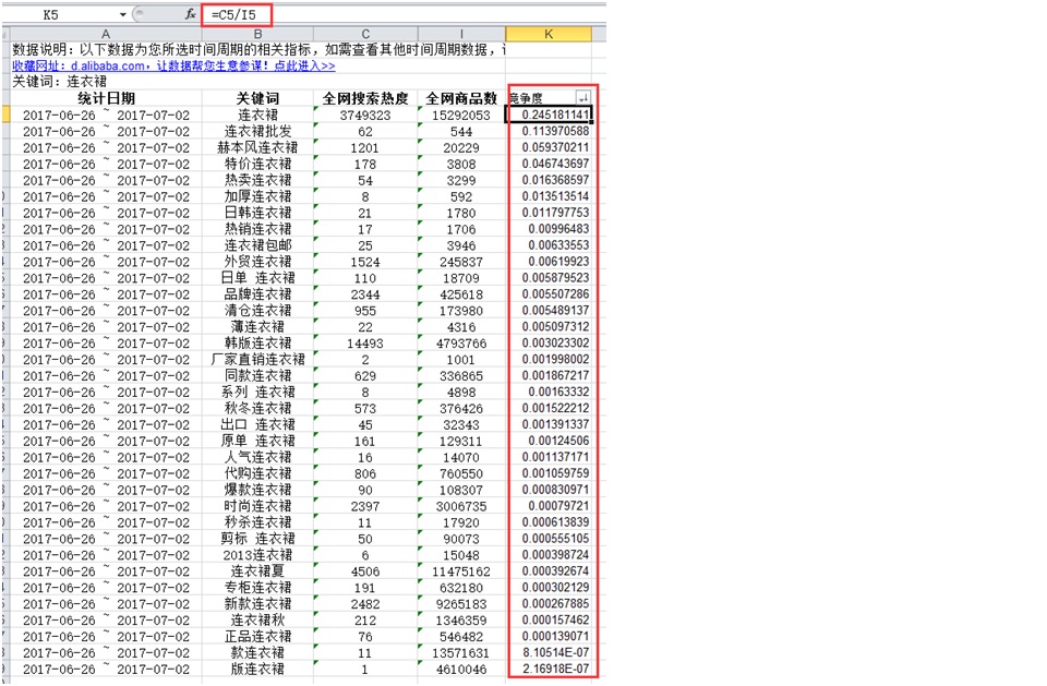 2、选词:整理好的表格有好多词,可是宝贝标题中我们最多只能写30个汉字,所以我们需要筛选一下。筛选的原则就是既是热词也是和宝贝相关的词,并且要避开大卖家直接竞争的词。我们可以用竞争度衡量这些词,竞争度就是热度和宝贝数量的比值,比值越大竞争度越小,比值越小竞争度越大。简单解释一下,就是说当关键词的热度相同,那么宝贝说越多分母越大,竞争越激烈,他们的比值就越小。我们可以在表格里增加一项竞争度,然后用EXCEL表格公式计算一下。见图8