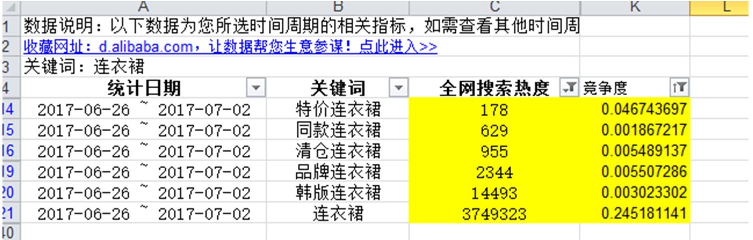 得出竞争度以后,我们要对此进行筛选,首先把关键词热度前30和热度前30的词都标注出来(取排名靠前的多少个数据,要根据词表的总体数量来定,最后得出的结果要够我们足够撰写标题),然后同时筛选得出热度和竞争度排名都靠前的词,如图9