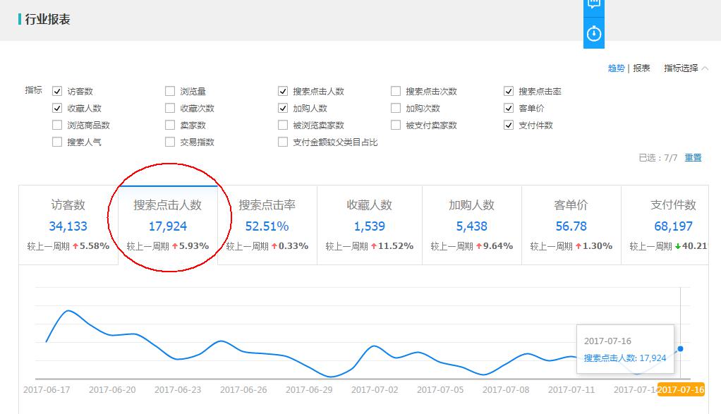 而我们再去行业大盘里面查看下滑那段时间的搜索点击人数。如果行业趋势都是下滑的话没必要大惊小怪。这跟旺季淡季,活动,天气,物流一些因素都有影响。